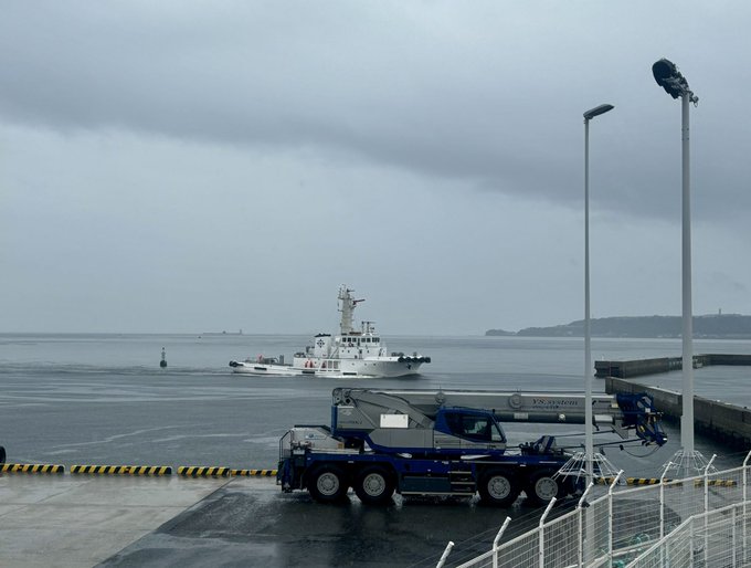 令和7年9月5日、今日の横須賀新港ふ頭のようすです。いま現在雨は小降りですが、大雨警報その他注意報が発令されているので注意が必要です。帰港する消防艇きよたきが見えました。