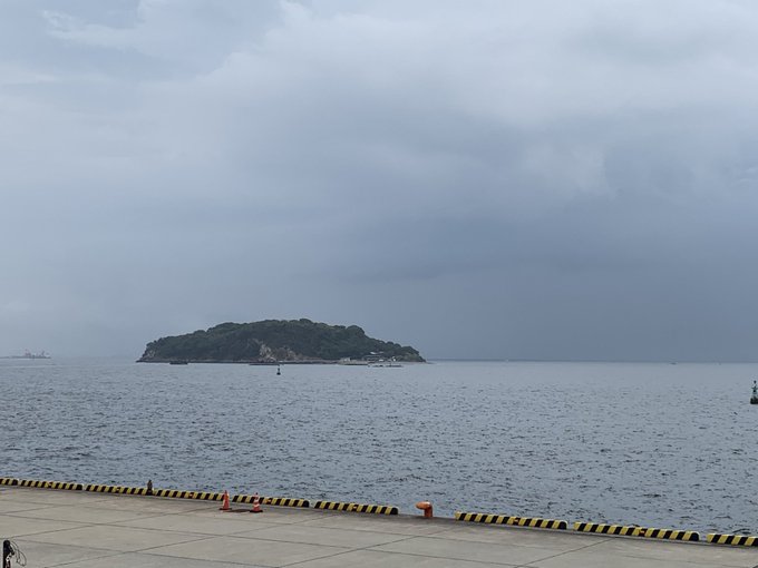 令和7年9月4日、今日の横須賀新港ふ頭ようすです。 雨はまだ降っていませんがどんよりとした雲が広がりとても蒸し暑くなっています。近くには停泊している船もなく無人島の猿島の全景が見えます。