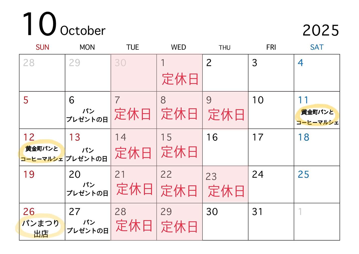 10月の営業スケジュールですいくつかイベントに参加いたします🥐①10月11日(土)12日(日)黄金町パンとコーヒーマルシェ②よこすかパンまつり@ポートマーケットどうぞよろしくお願い致します☺️定休日は..