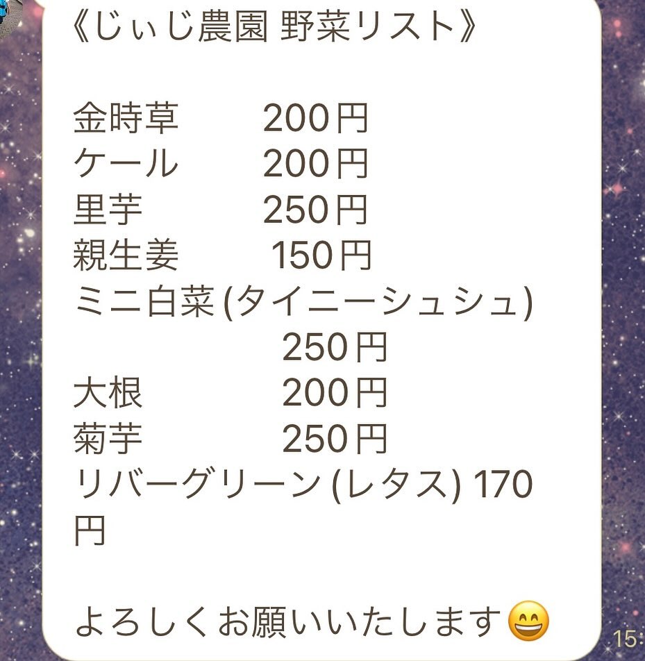 来週月曜日にお渡しのじぃじ農園さん coeur_a_coeur_jiijinouenのお野菜リストですご希望の方は明日までにご連絡下さい#cococafe#じぃじ農園