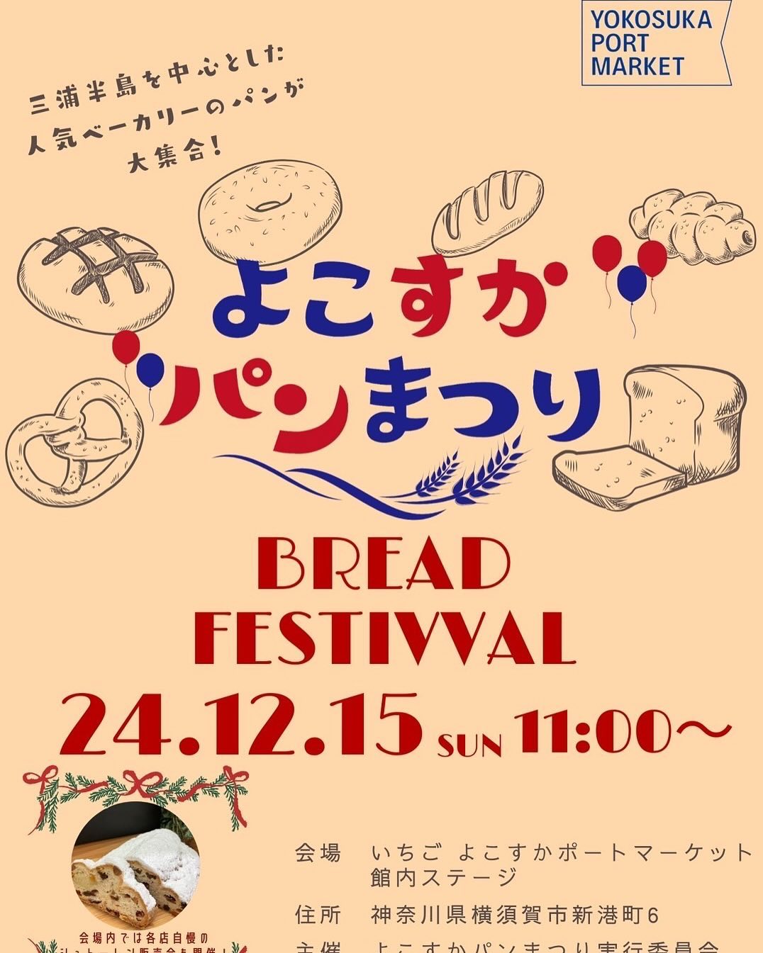 『よこすかパンまつり』がよこすかポートマーケットで開催されます。2枚目の写真は本日より登場したシュトーレンのハーフサイズのシュトーレンミニです。お買い求めやすいサイズなのでぜひお試しください。#ブロー..
