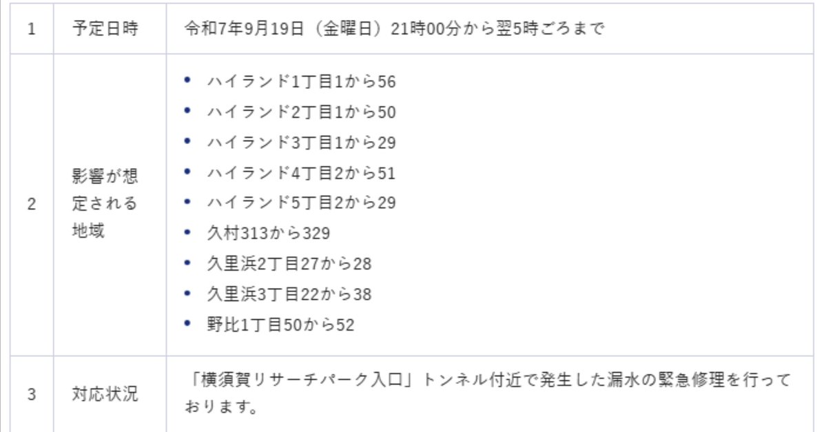 【断水のお知らせ】緊急の漏水修理に伴い、ハイランド、久村、久里浜、野比の一部で断水が発生する見込みです。(予定時間21時00分から翌5時ごろまで)給水車の配置など、今後の状況は市のHPでご確認ください..