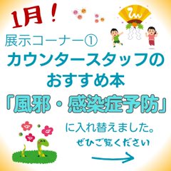 【展示】「カウンタースタッフのおすすめ本」の1月の展示テーマを、「風邪や感染症予防」に入れ替えました。ぜひご覧ください。 ※「カウンタースタッフのおすすめ本」は、4階階段横のワゴンに置いてあります。