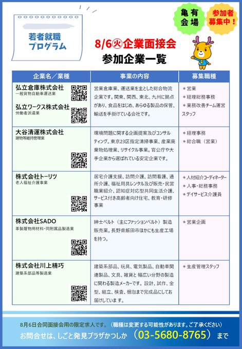 現在開催中の若者就職プログラムの #面接会 参加企業が決定しました!#人材採用 に積極的な魅力ある #葛飾区 の企業です。 ◆セミナーもまだ間に合います!お問合せください! https://katsushika-shigoto.net/news/6498 #葛飾 #求人 #就職 #正社員 #事務 #営業企画 #介護員 #人事 #総務 #生産管理 #経理 #総合職