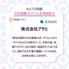 【9/17㊋10:00~15:30開催】 #女性就職面接会 参加企業紹介⑤ 企業名:株式会社アサヒ 事業内容:#筐体設計 #機構設計 https://kk-asahi.co.jp #葛飾 #企業面接会 #就活イベント #採用 #転職 #就活 #葛飾で働こう #営業 #生産管理 #品質管理 #資材購買 #組立 #検査