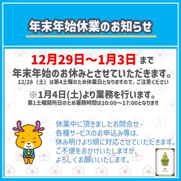 広報担当の #やるシカ です! 「しごと発見プラザかつしか」は12/29より1/3まで、お休みさせていただきます。 尚、年内業務は12/27(金)19時まで、年明けは1/4(土)10時より業務を開始します。HPからのお問合せ分は、お返事が年明けになります。ご了承ください。 https://katsushika-shigoto.net