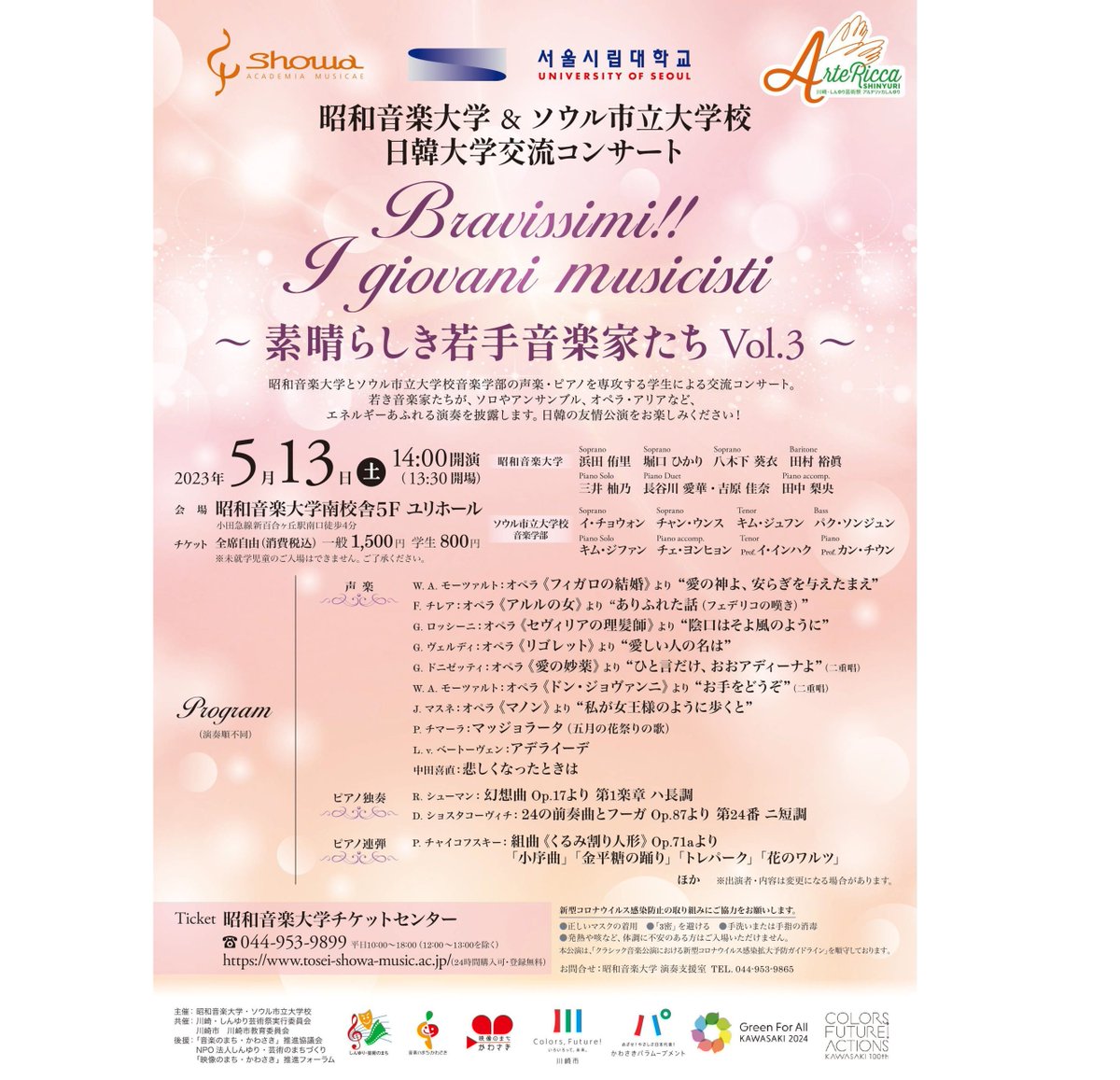【昭和音楽大学&ソウル市立大学校 日韓大学交流コンサート ~素晴らしき若手音楽家たちVol.3~】🎵開催日時:2023年5月13日(土)14:00開演(13:30開場)🎵開催場所:昭和音楽大学 ユリホ..