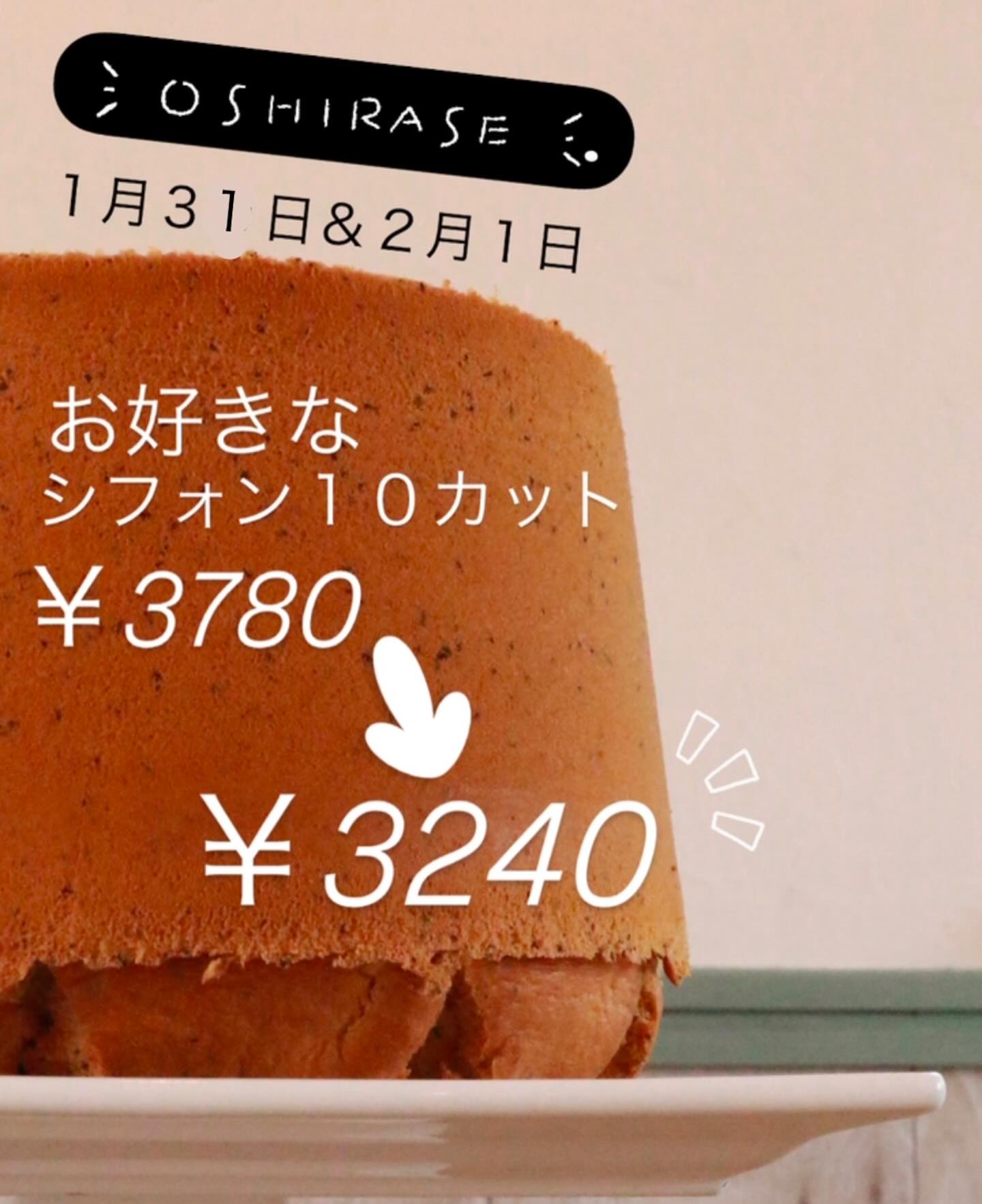 先程の投稿で1月の営業は終わりと書いたのですが、外販が雪予報の為、延期になってしまったので、少しシフォン販売します🥺✨.雪の日の日曜日のおやつにシフォンはいかがでしょうか☺️💓