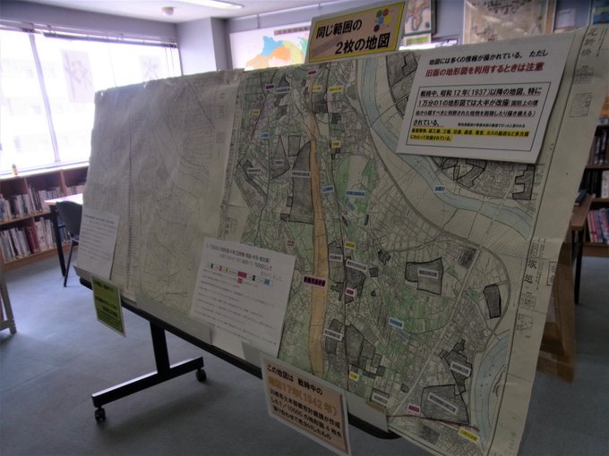 #地名資料室の#戦後80年展示その2所蔵する昭和17年戦時中の1万分の1地形図の幸区、中原区付近と、同じ範囲の昭和21年発行の東京戦災白地図5千分の1の地形図を、比較展示中です。国防上の理由で改変され..