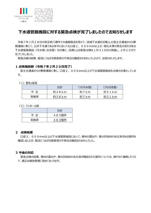 【下水道管路施設に対する#緊急点検が完了しました】1月31日から、口径2,000mm以上の硫化水素の発生の恐れがある下水道管路施設を対象に、目視による緊急点検を実施していましたが、2月20日で完了しま..