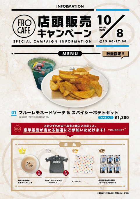 数量限定本日15:00〜17:00でテイクアウト限定の店頭販売を実施スパイシーポテトは店頭販売限定メニューとなりますので、この機会にぜひお召し上がりください上記メニューをご注文いただいた方は豪華景品が..