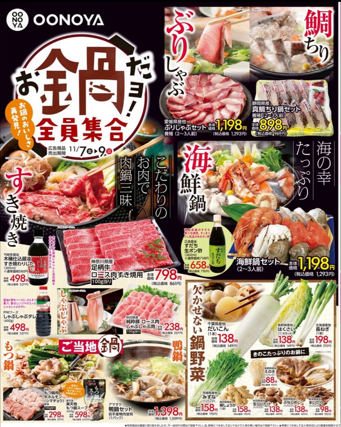 🍲お鍋だヨ!全員集合🍲✨肌寒い夜が増え、お鍋がおいしい季節の到来😋OONOYAのおすすめの食材でぽかぽか鍋💕🥩お肉🥩すき焼き・しゃぶしゃぶ・鴨鍋・もつ鍋✨お鍋に美味しいお肉がお買い得🉐✨🐟お魚🦐具..