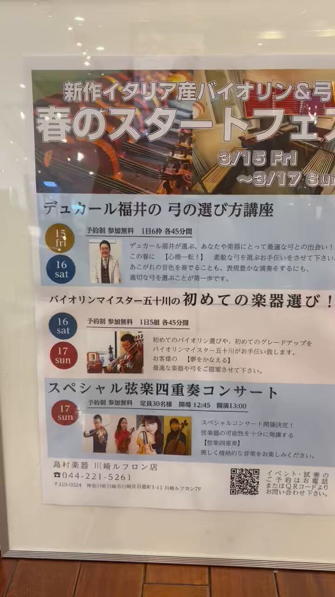 本日より開催! 【春のスタートフェア バイオリン&弓】 🎻バイオリンマイスター五十川オススメのバイオリンがたくさん! 🎻特にイタリア新作楽器はバイオリンを弾くのがもっと楽しくなります! ぜひ週末は川崎ルフロン店へお越しください!