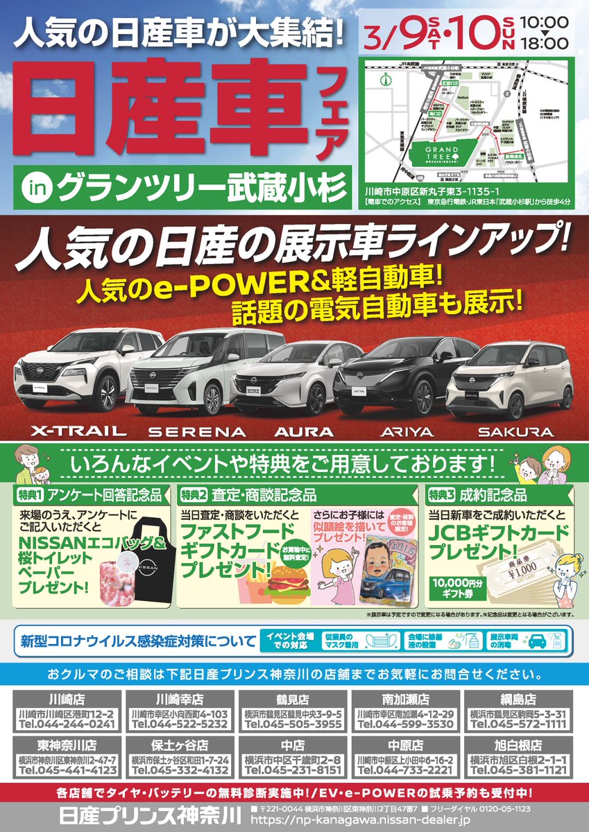 /3/9(土)~10(日)は、「日産車フェアinグランツリー武蔵小杉」を開催いたします!\最新の人気ナンバーワンミニバン最先端の電動SUVなどがグランツリー武蔵小杉に大集合!〝見て・触って・乗って〟新..