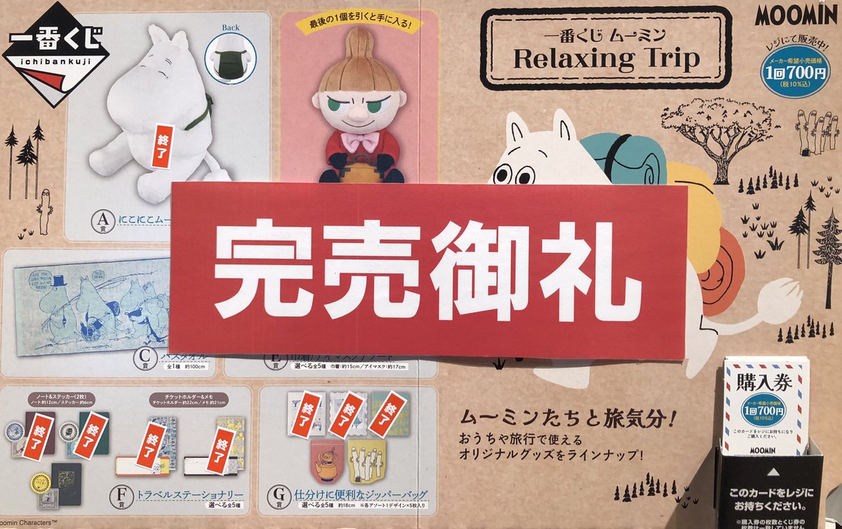 【#一番くじ情報】『一番くじムーミンRelaxingTrip』完売いたしました‼️ご利用ありがとうございました😊000