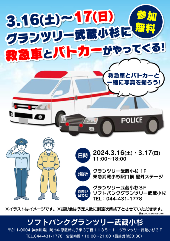 / 3/16(土)~3/17(日)は 「グランツリー武蔵小杉に救急車とパトカーがやってくる!」 を開催! \ 映画やドラマ撮影で使用される パトカーと救急車の前で 家族そろって記念撮影!📸 どなたでも参加無料で お楽しみいただけます! 詳細は👉