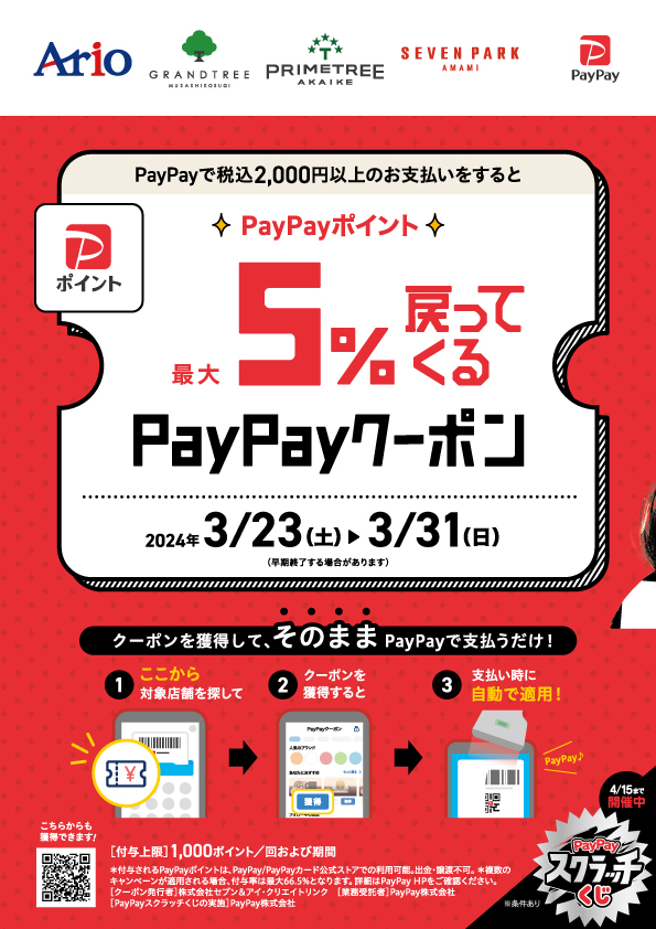 /3/23(土)~3/31(日)はPayPayポイント最大5%戻って来るクーポンゲットを開催!\期間中、対象店舗にてPayPayでお支払いすると最大5%のPayPayポイントが戻ってくるクーポンをPa..