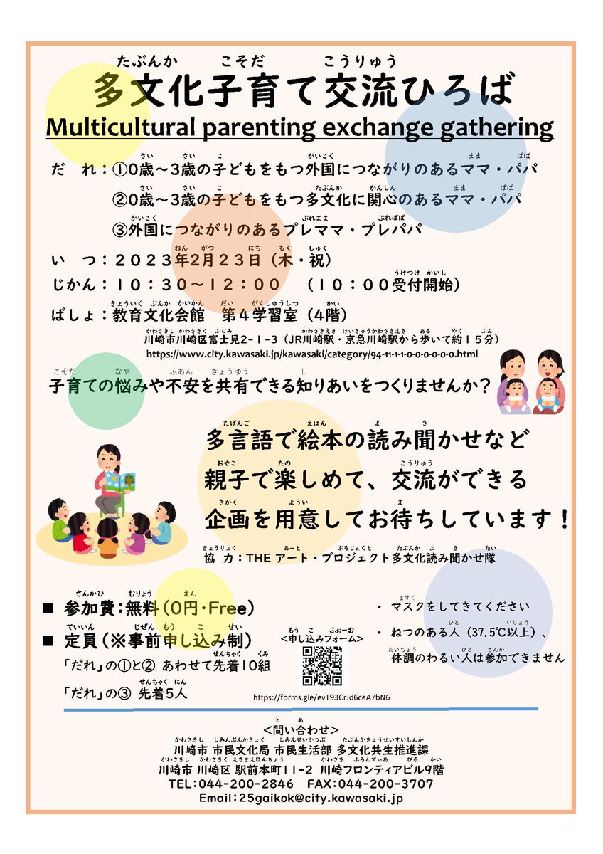 2月23日(木・祝)に 教育文化会館で 多文化子育て交流ひろばを開催します!子育ての悩みや不安を共有できる 知りあいをつくりませんか?多言語で絵本の読み聞かせなど 親子で楽しめて 交流できる企画を用意..