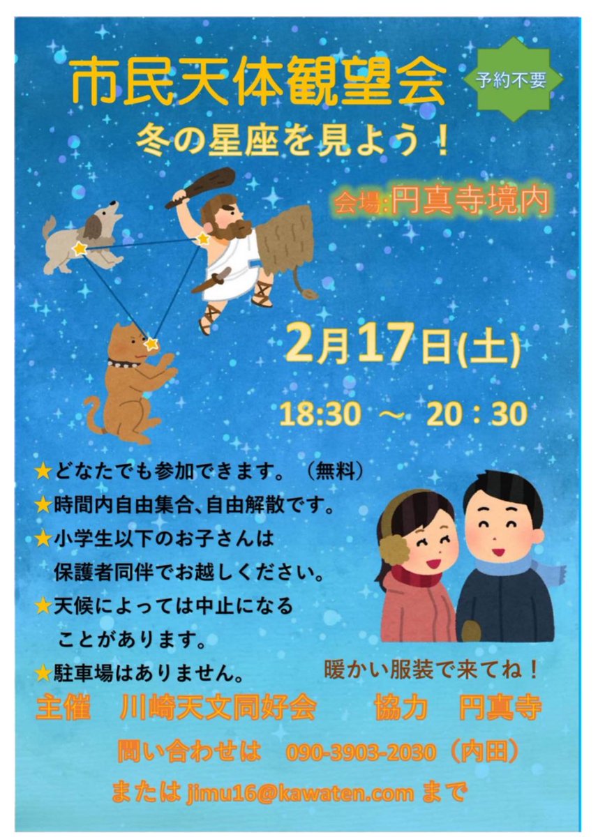 2月17日おはようございますー御案内ー今日夕方 当院駐車場におきまして市民天体観望会(主催:川崎天文同好会)が行われます。18:30〜20:30の間にお越しいただければ、天文同好会員様の天体望遠鏡で星..