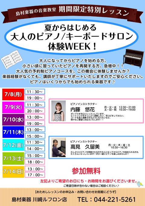 【ピアノ&キーボードサロン体験Week】いよいよ明日からスタート!!ピアノ、キーボードを始めたい方、必見です!お問い合わせはこちら↓↓044-221-5261担当:高見・内藤#ピアノ#島村楽器..