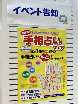 ◆イベントのお知らせ◆#たちばな出版の商品を購入していただくと手相占いイベントに参加できます!対象本に付属の短冊とレシートを忘れずご持参下さい。あわせて当店で手相占いフェアもやっておりますのでご来店お..