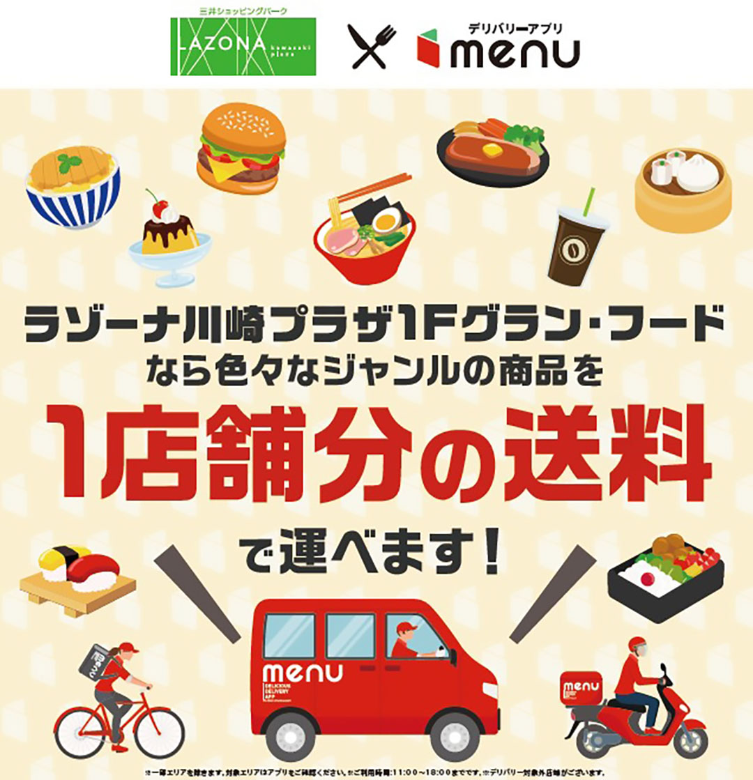 デリバリーアプリ「menu」で、1F グラン・フード一部店舗の商品をご注文いただけます!注文後最短30分でお届けが可能なほか、1回分の送料で1F グラン・フード内の商品をまとめて注文できるのもうれしいポイントぜひご利用ください #ラゾーナ