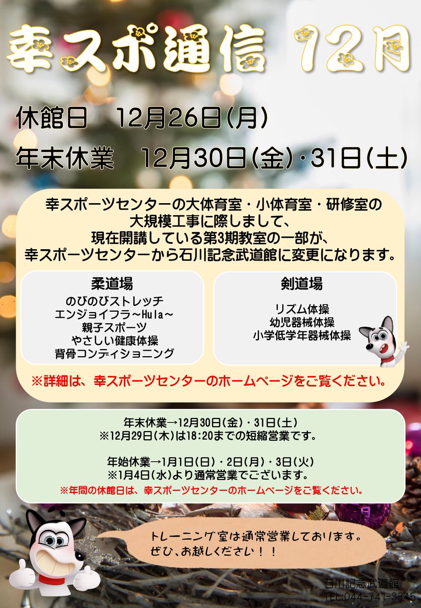 12月の休館日は来週26日(月)でございます‼️お気を付けくださいませ。明日、明後日と皆様のご来館をお待ちしております☺️❤️#川崎市#幸区#幸区役所#幸スポーツセンター#石川記念武道館#トレーニング..