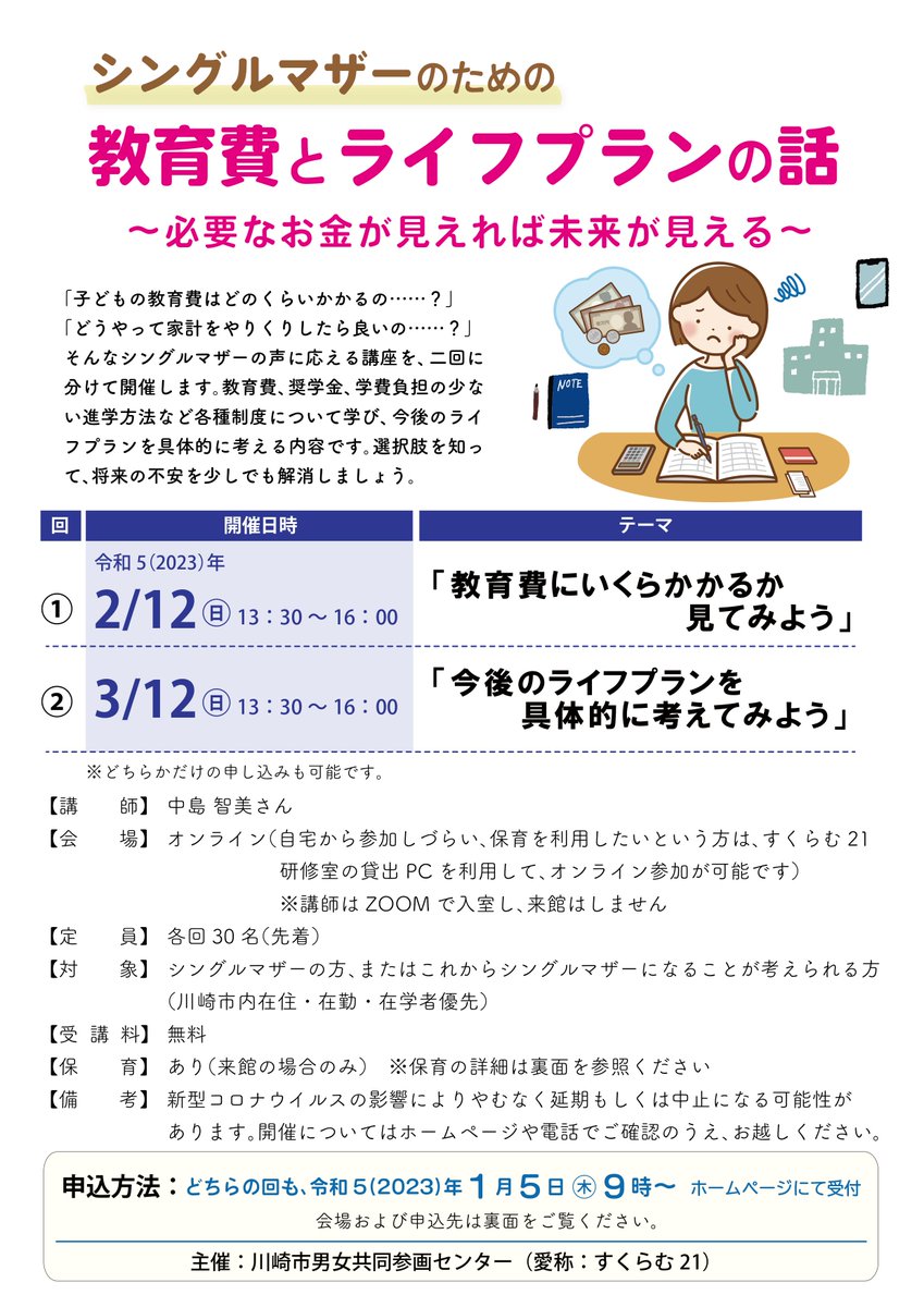 今年度もシングルマザー向けの講座を開催します✨ 2回ありますが、どちらかだけの参加も可能です! 申し込みはこちらから👇 #川崎 #シングルマザー #教育費 #オンライン講座