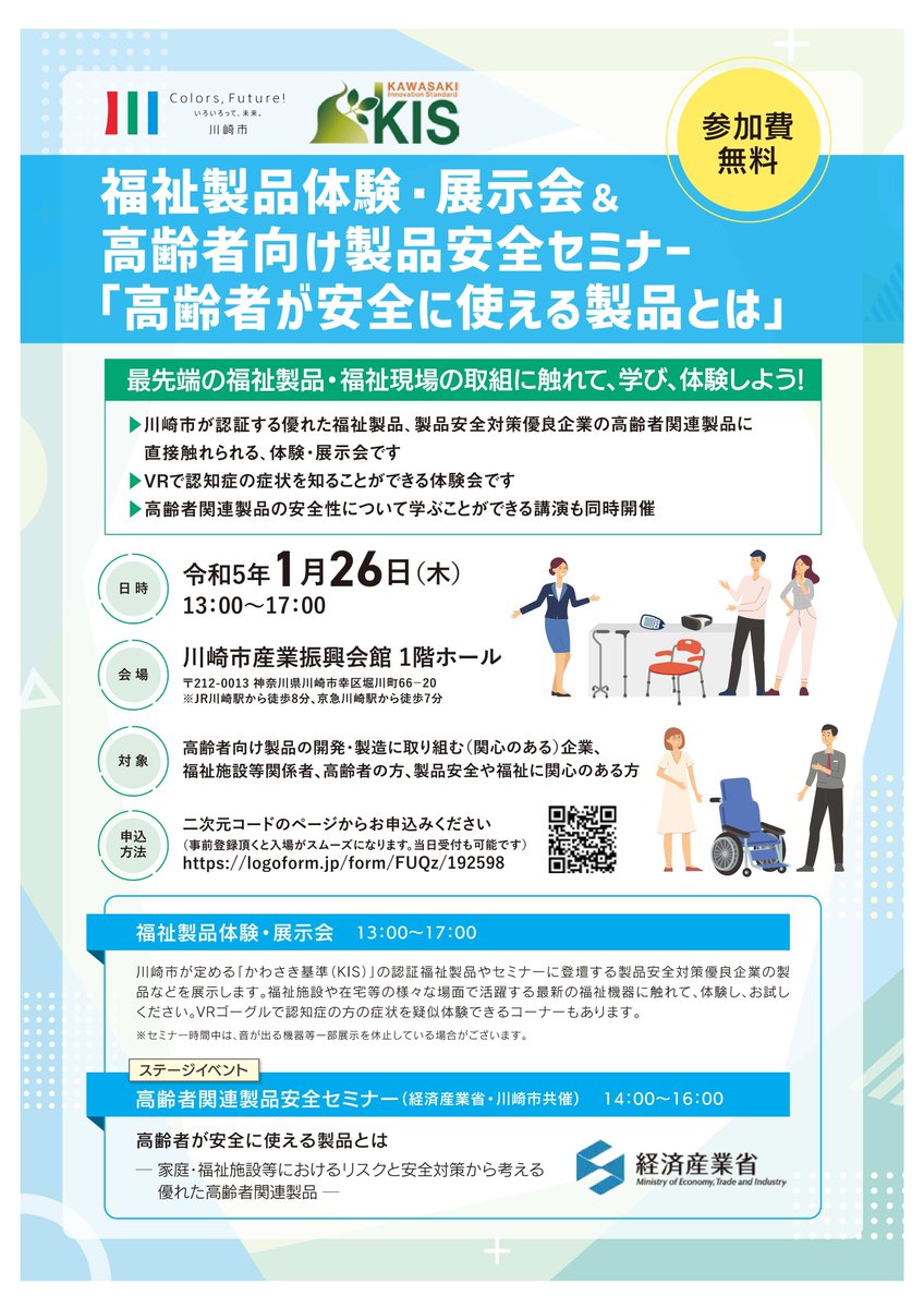 令和5年1月26日(木)に「福祉製品体験・展示会&高齢者向け製品安全セミナー」を川崎市産業振興会館で開催!●#かわさき基準(KIS)認証福祉製品等の体験・展示●VRでの認知症体験コーナー●高齢者関連製..