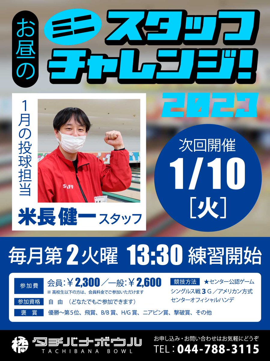 明日1月10日[火]は13:30より【お昼のミニ🎳スタッフチャレンジ】開催!【米長健一スタッフ】が皆様と一緒に投球します😊休日の大会より参加費がちょっぴりお得なミニチャレンジです😉大会に慣れたい初心者..