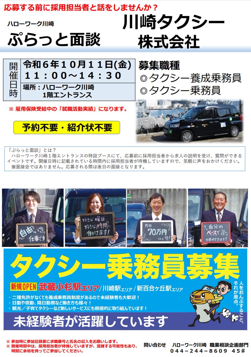 #タクシー乗務員の#会社説明会を#ハローワーク川崎1階エントランスにて開催予定10/11(金)11:00~予約不要採用担当者が会社の特徴や求人内容について説明をおこないます。気軽に質問もできます。#ぷ..