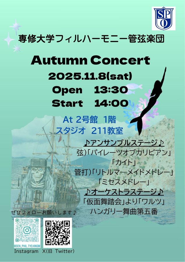 我々専フィルは鳳祭に参加します!11月8日(土)の14時から、2号館1階(スタジオ211教室)にて演奏します弦楽器と管楽器によるアンサンブルと、オーケストラの盛りだくさんのプログラムです皆さんも聴いた..