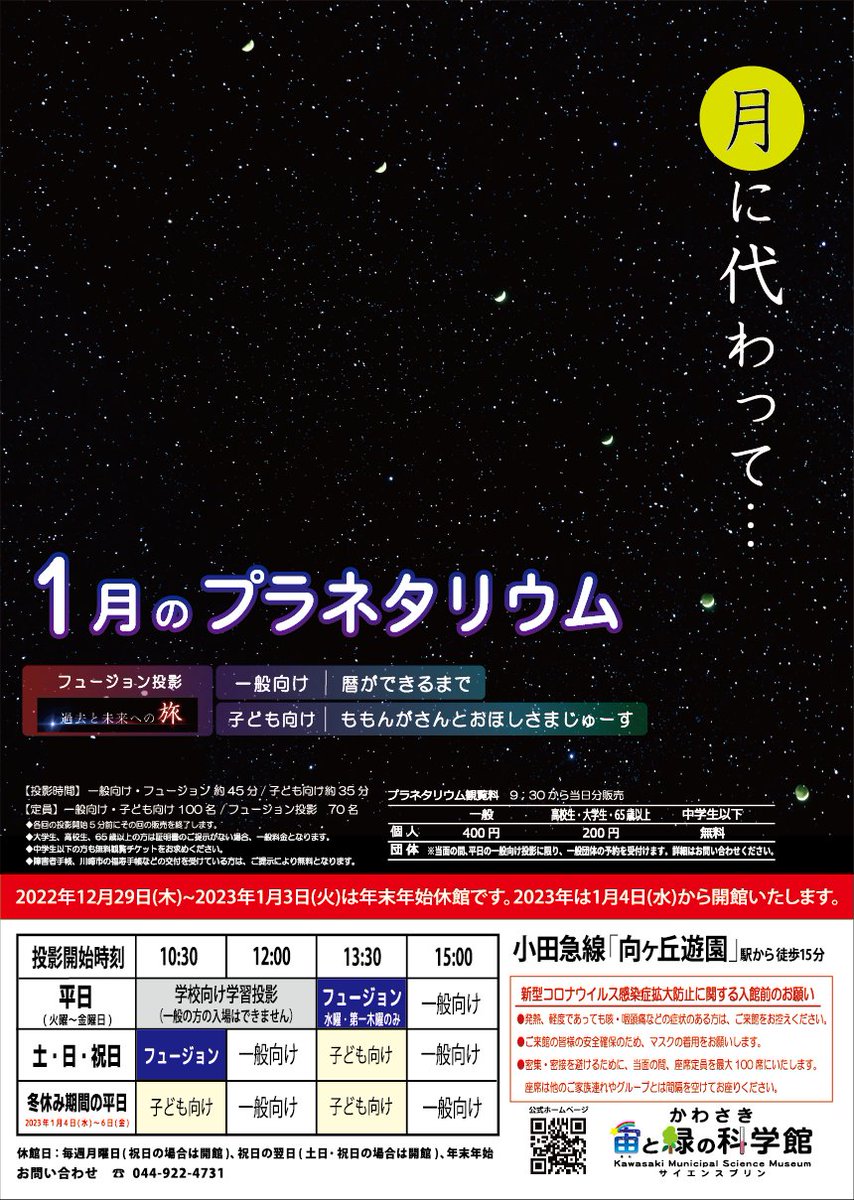 【プラネタリウム1月の番組のご案内】◆一般向け投影「暦ができるまで」(全編生解説)◇子ども向け投影(4~9歳程度向け)「ももんがさんとおほしさまじゅーす」(生解説+アニメーション)2023年は1月4日..
