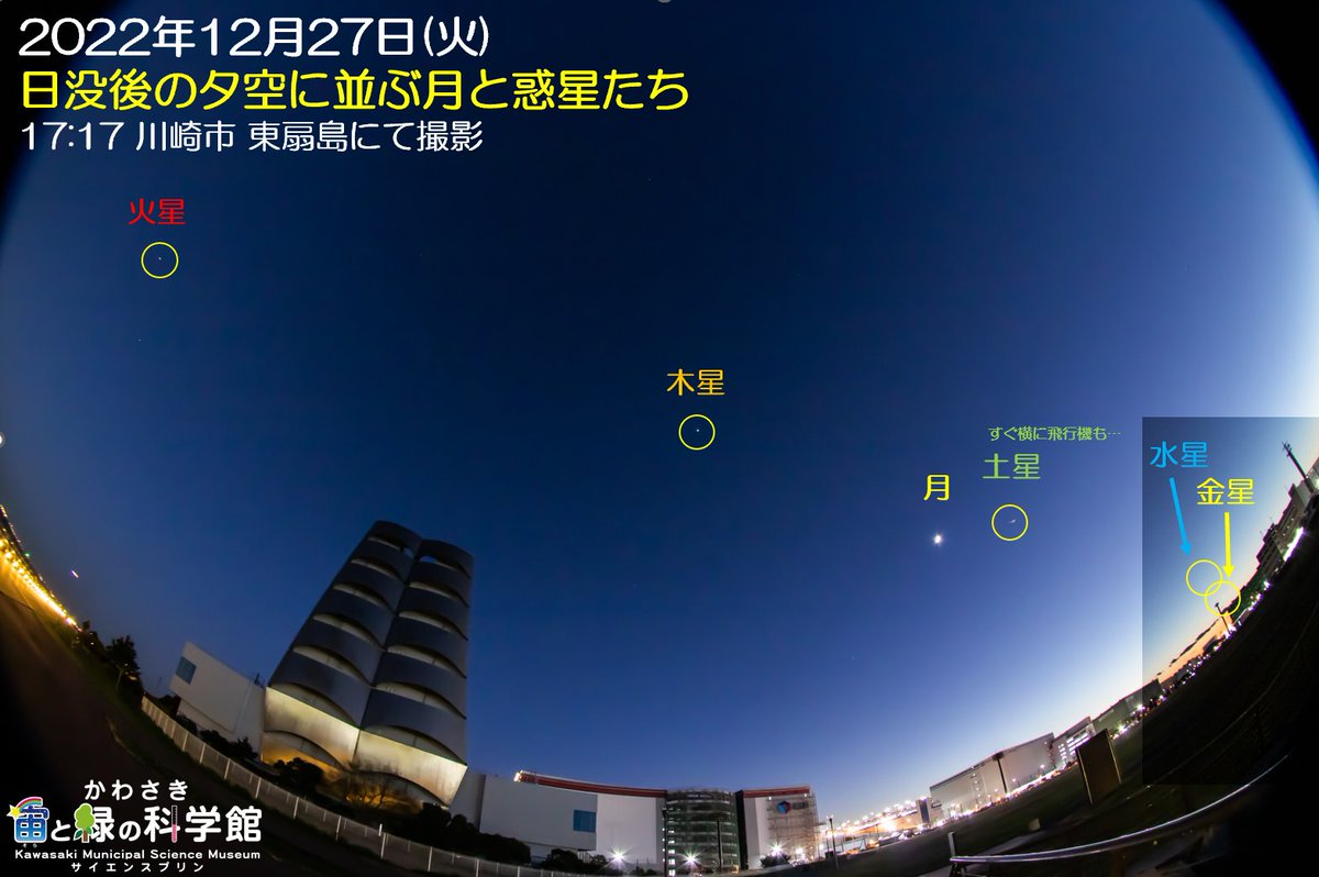 【夕空の惑星大集合】昨日27日の夕空には、西の低空の金星と水星、さらに土星、月、木星、火星が南~東の空に並び、1週間の曜日の惑星が全て見られました。月は形を変えながら東へと移り、また水星は明日29日に..