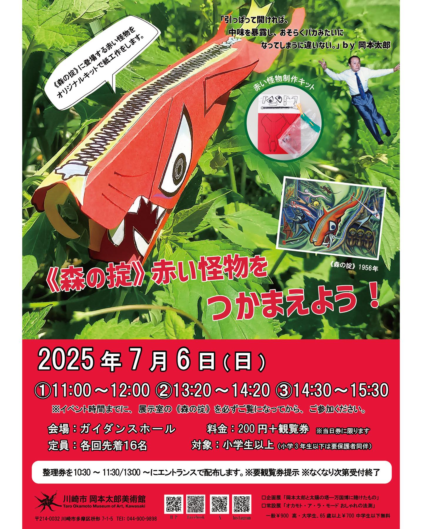 【7/6イベント情報】本日は、7/6(日)開催予定のイベント「《森の掟》赤い怪物をつかまえよう!」をご紹介します👏✨岡本太郎作品の中でも人気のある絵画《森の掟》🌳登場キャラクターの中で一番大きくて目立..