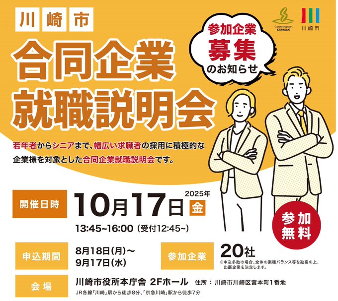 参加企業募集若年者からシニアまで、幅広い世代の求職者の採用に積極的な企業様を対象とした「#川崎市#合同企業就職説明会」を10月17日(金)に#川崎市役所本庁舎2階ホールで開催!(#無料・20社)参加者..