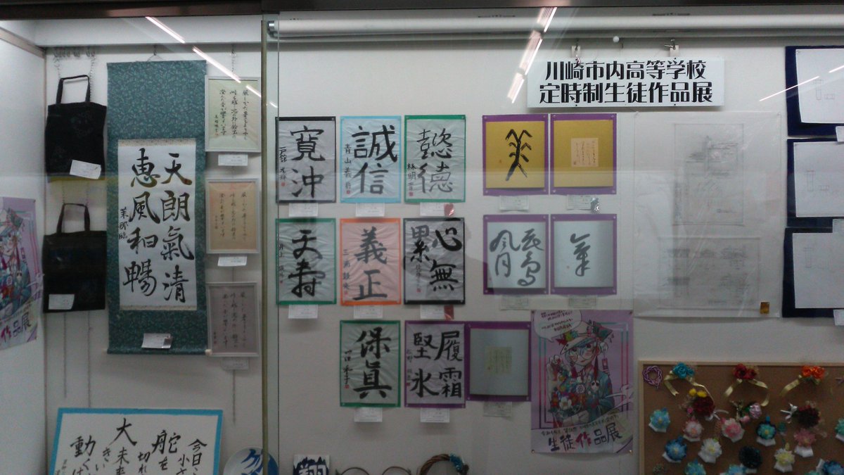 市内高等学校定時制生徒による作品展が、川崎地下街アゼリアの展示コーナーの一角で開催されています。書写、小物、図面等、多種多様な作品が並んでいます。お時間あればちょっと立ち止まって見てみてください。01..