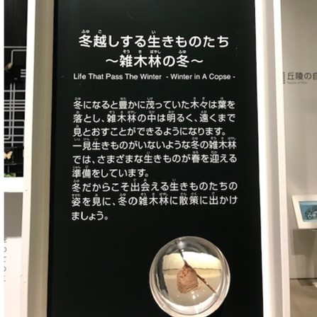 冬の雑木林を探ると、厳しい季節を乗り越える生きものたちが見つかります。土の中ですごすもの、葉っぱの下にいるもの、卵で乗り切るもの、あえて成虫になるもの…。展示の「雑木林の冬」コーナーでご紹介しています。さて冬休み、皆さんはどのように過ごされましたか。