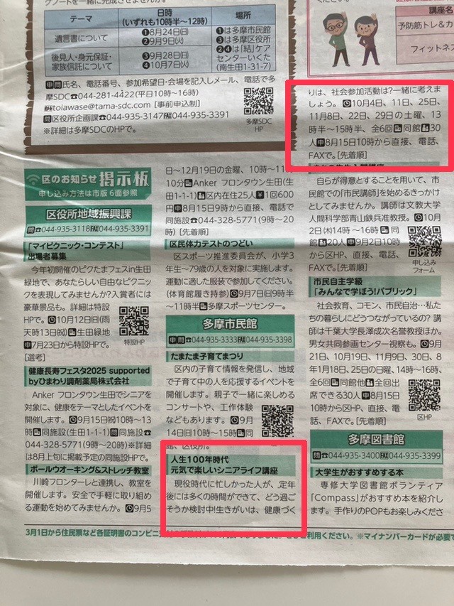 〝令和7年度 多摩市民館市民自主学級〟にて、弊社代表が所属する「(一財)健康・生きがい開発財団」で推進しています「100歳大学」の一環として、財団の地域組織である「(一社)神奈川健康生きがいづくりアドバイザー協議会」が主となり、『人生100年時代 元気で楽しいシニアライフ講座』を10月から計6回に渡り多摩市民館にて開催致します😊
