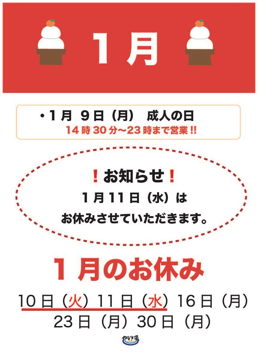 本日朝風呂♨️・8時〜17時(最終受付 16時30分)朝風呂ラストです!!明日から通常営業🐈遅れましたが営業日程です✋成人の日は振り替え営業‼️‼️その後にお正月休みということで11日(水)お休みいた..