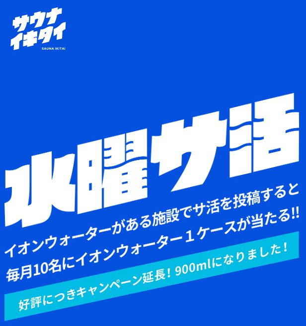 サウナーの皆さま~今日は何曜日ですか~今日は水曜日ですよ~水曜サ活の日ですよ~そして・・・・サウナイキタイ会員証をお持ちの皆さま~フロントでお見せいただければ・・・イオン900を1本差し上げますよ~