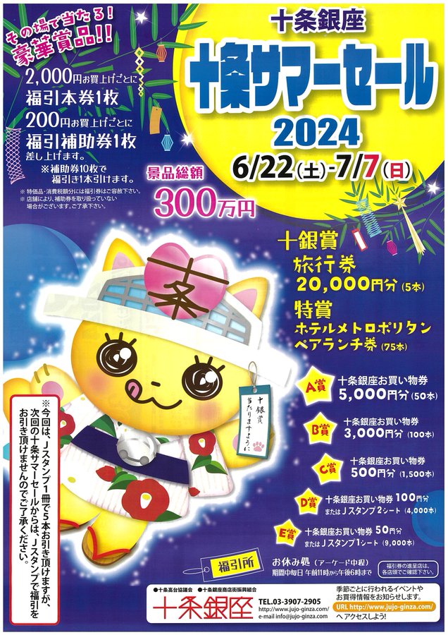 こんにちは!十条銀座商店街事務所です。十条銀座サマーセール開催中!!是非ご参加ください。お休み処にある抽選所、2Fの事務所ともに午後6時まで営業です。(い)