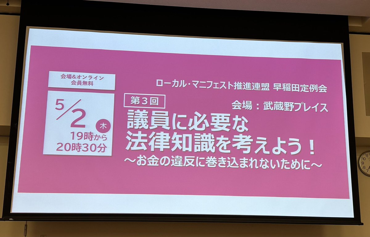 5/2ポスティングの後は、武蔵野プレイスにて #ローカルマニフェスト推進連盟 早稲田定例会 「議員に必要な方的知識を考えよう」