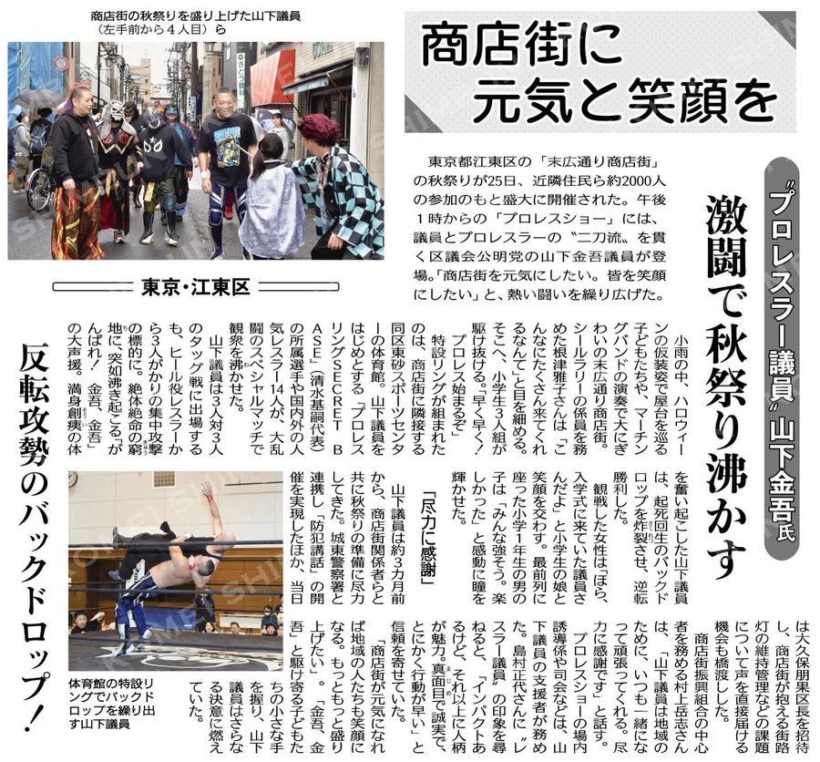 先日開催された「末広通り商店街ハロウィンフェスティバル」の様子を、公明新聞で取り上げていただきました! プロレスを通して、地域の皆さんに元気と笑顔を届けられたこと、本当に嬉しく思います。 これからも商店街を盛り上げていきます!