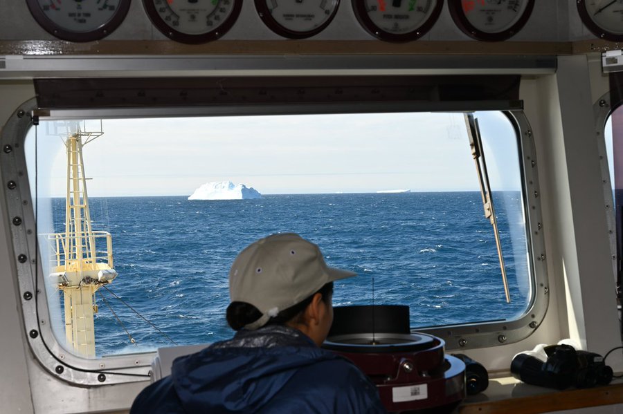 【航海レポート】実習航海中・海鷹丸より1月25日今日のミッションは2年前に設置した係留系の回収です。係留系の浮上場所が結構氷山に近くブリッジのワッチも真剣です。#航海レポート#海鷹丸#係留系#氷山
