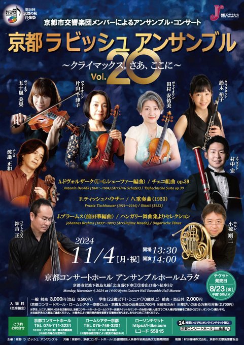 【明日よりチケット発売!】京都市交響楽団メンバーによるアンサンブル・コンサート京都ラビッシュアンサンブルVol.20(11/4)~クライマックス。さあ、ここに~2002年に京都市交響楽団メンバー8名を..