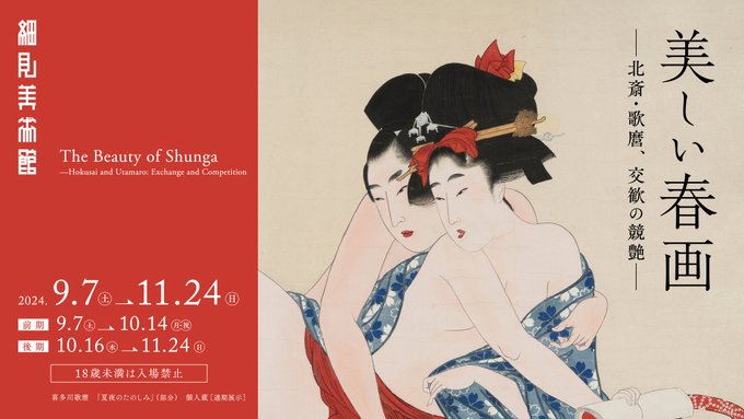 ◤開幕まであと2週間◢「美しい春画―北斎・歌麿、交歓の競艶―」9/7㊏開幕版画・版本の作品に加え#肉筆春画に焦点をあてる本展。日本の美術館では初公開となる作品や、海外からの里帰り作品を含む、美麗な春画..