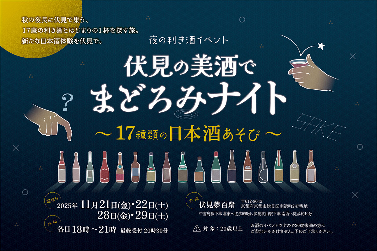 【PR】「伏見の美酒でまどろみNIGHT」参加者募集中伏見の蔵元から厳選された17銘柄を飲み比べ!味と香りで“同じお酒”を探し当てる利き酒イベント11月21日・22日・28日・29日伏見夢百衆で開催!..