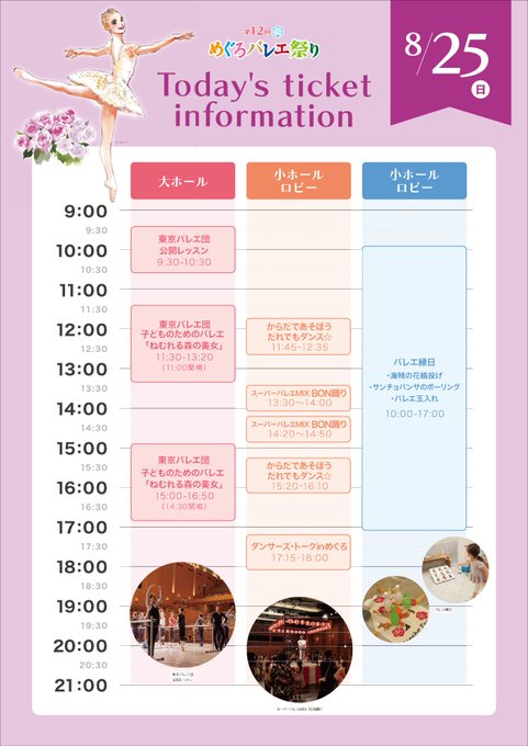 / #めぐろバレエ祭り 最終日 8/25(日)開催イベント 当日券情報 \ 大ホール ◎9:30~10:30 公開レッスン 9:00から会場チケットブースにて ◎11:30開演/15:00開演 『#ねむれる森の美女』 10:30から会場チケットブースにて 小ホールロビー ◎10:00~17:00 バレエ縁日