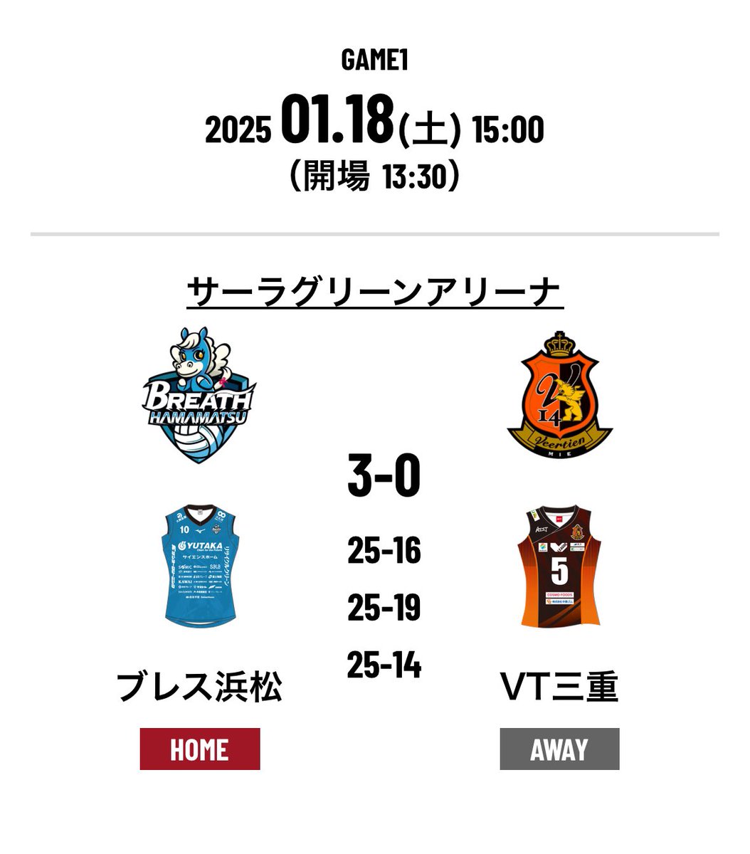 AWAYGAME浜松大会1月18日(土)サーラグリーンアリーナブレス浜松16-2519-2514-25セットカウント0-3で敗戦となりました。応援いただきありがとうございました通算成績4勝7敗順位9位..